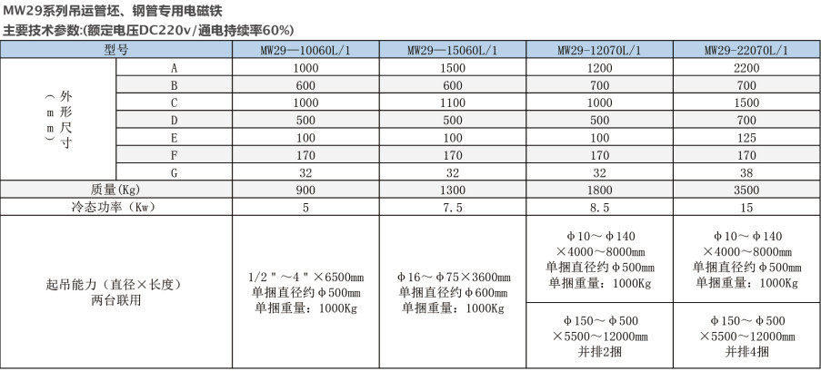 產品介紹:適用于吊運管壞、鋼管專用電磁鐵。磁極結構為扁平狀,適合搬運各種外徑、長度、根數、捆數的捆扎鋼管。磁極面無突起,不會損害鋼管表面。操作靈活,一次可吊數捆。可以根據用戶的需要將配套整流控制設備設計成無線遙控和手動控制式,實現地面遠程無線控制。請根據聯用臺數的功率之和來選用配套控制設備。